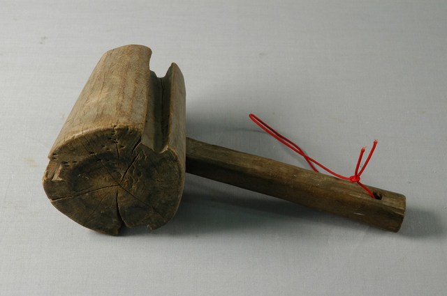 1.本物件為打草繩輔助器具,又名「三股編織器」。外型為1根木槌,木槌槌頭外緣挖有3個溝槽,可用來固定3條細草繩,編成1條較粗草繩。