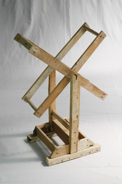 本物件為傳統木製手工紡線機,以木條釘製而成,由底座及轉軸組成,可供紡線用。