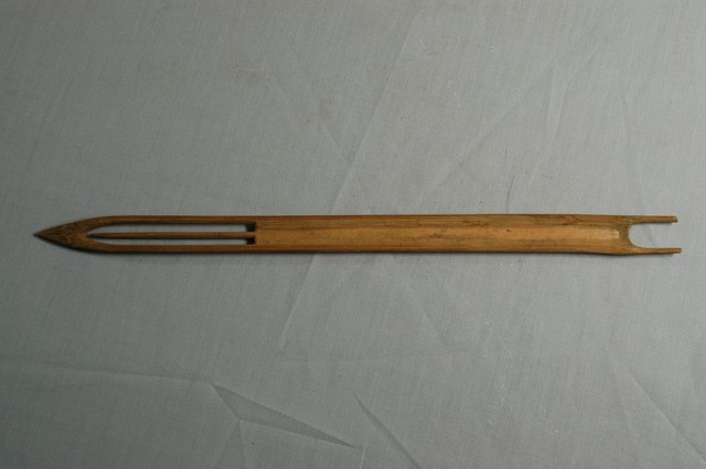 本物件為竹製漁網結網器,結網器為梭狀,除結網外亦作為修補漁網之用途,其材質有竹、木、鐵、銅、塑料,竹製為較常見,可略分為大號(約20-50cm,用來封漁網及修補粗線網)、小號(10cm以下,主要用來修補漁網)及介於其中的中號,中號由於大小適中,主要用來織各種漁網,結網器為織漁網的重要工具。