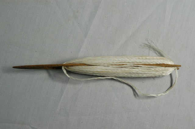 本物件為竹製漁網結網器,帶釣線一小段,結網器為梭狀,除結網外亦作為修補漁網之用途,其材質有竹、木、鐵、銅、塑料,竹製為較常見,可略分為大號(約20-50cm,用來封漁網及修補粗線網)、小號(10cm以下,主要用來修補漁網)及介於其中的中號,中號由於大小適中,主要用來織各種漁網,結網器為織漁網的重要工具。