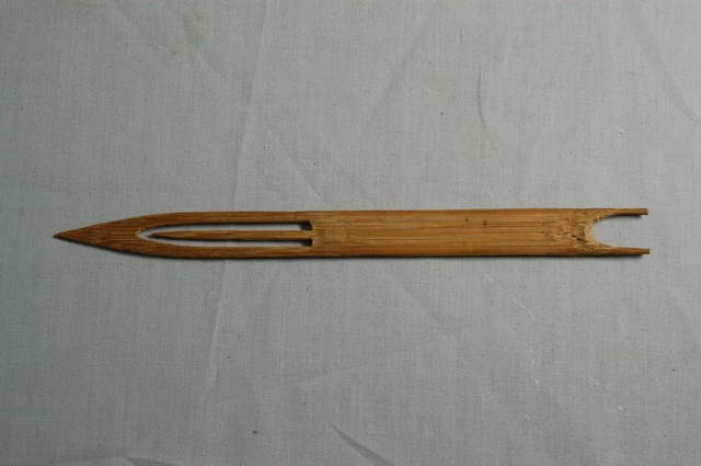 本物件為竹製漁網結網器,結網器為梭狀,除結網外亦作為修補漁網之用途,其材質有竹、木、鐵、銅、塑料,竹製為較常見,可略分為大號(約20-50cm,用來封漁網及修補粗線網)、小號(10cm以下,主要用來修補漁網)及介於其中的中號,中號由於大小適中,主要用來織各種漁網,結網器為織漁網的重要工具。