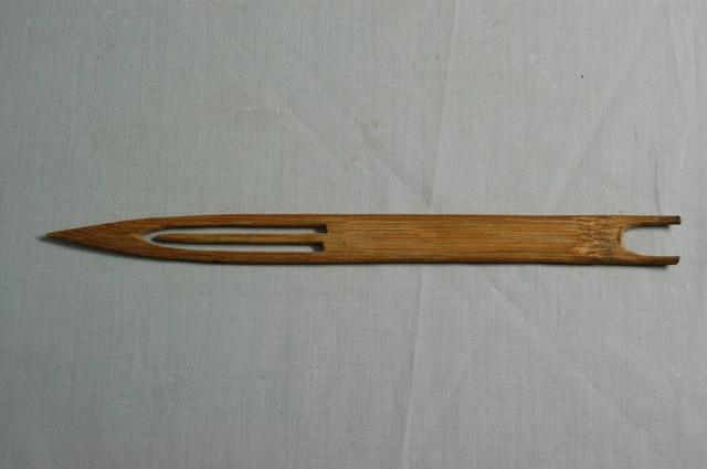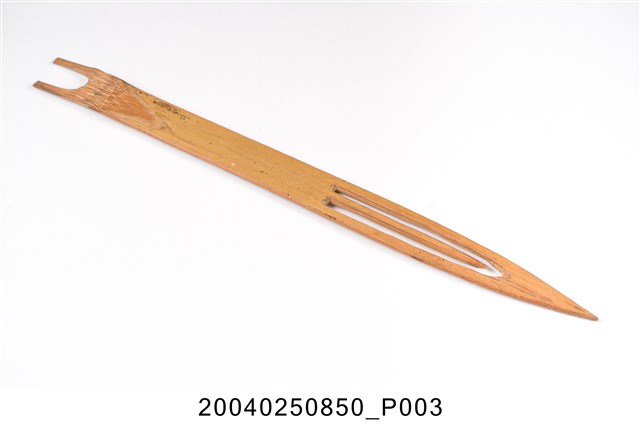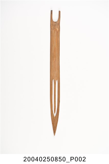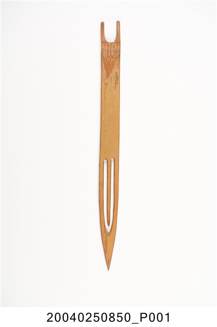 本物件為竹製漁網結網器,結網器為梭狀,除結網外亦作為修補漁網之用途,其材質有竹、木、鐵、銅、塑料,竹製為較常見,可略分為大號(約20-50cm,用來封漁網及修補粗線網)、小號(10cm以下,主要用來修補漁網)及介於其中的中號,中號由於大小適中,主要用來織各種漁網,結網器為織漁網的重要工具。