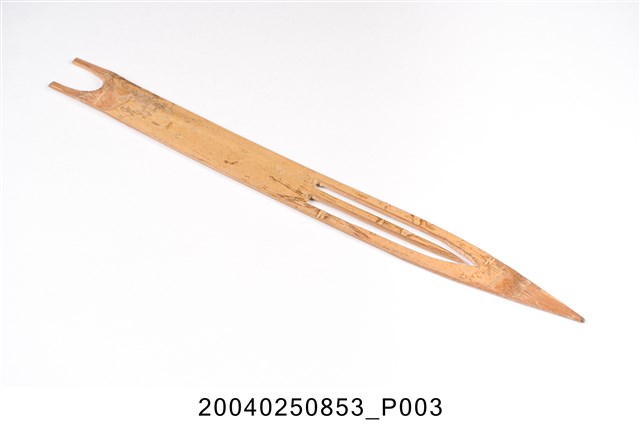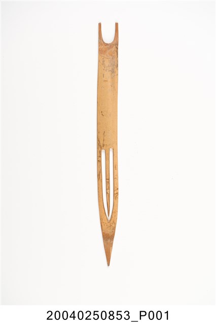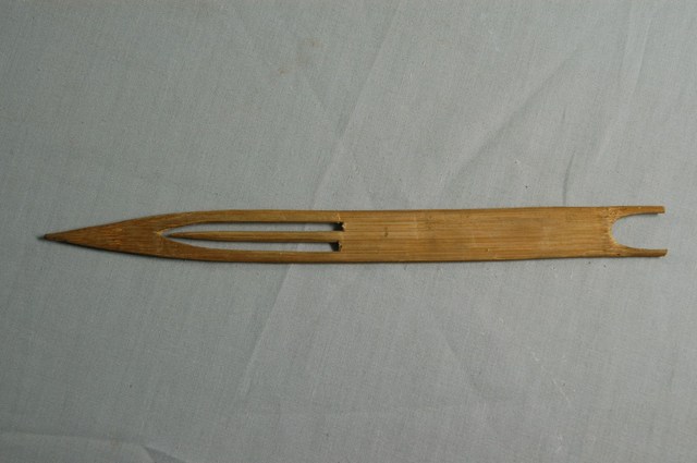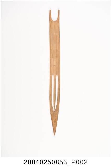 本物件為竹製漁網結網器,結網器為梭狀,除結網外亦作為修補漁網之用途,其材質有竹、木、鐵、銅、塑料,竹製為較常見,可略分為大號(約20-50cm,用來封漁網及修補粗線網)、小號(10cm以下,主要用來修補漁網)及介於其中的中號,中號由於大小適中,主要用來織各種漁網,結網器為織漁網的重要工具。