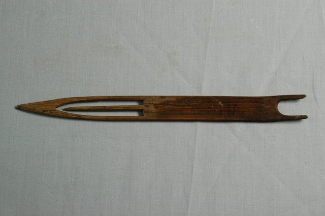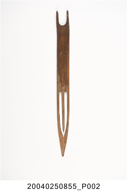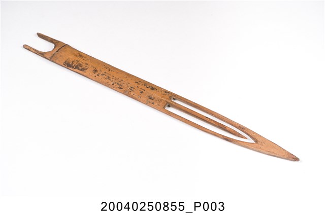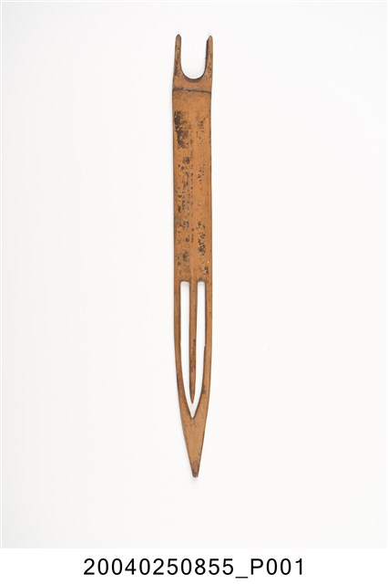 本物件為竹製漁網結網器,結網器為梭狀,除結網外亦作為修補漁網之用途,其材質有竹、木、鐵、銅、塑料,竹製為較常見,可略分為大號(約20-50cm,用來封漁網及修補粗線網)、小號(10cm以下,主要用來修補漁網)及介於其中的中號,中號由於大小適中,主要用來織各種漁網,結網器為織漁網的重要工具。