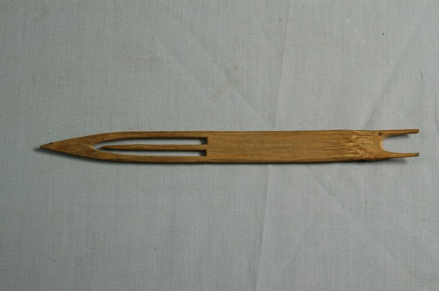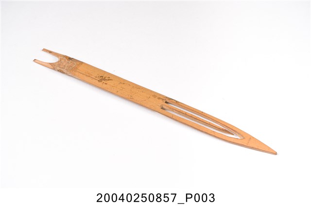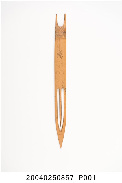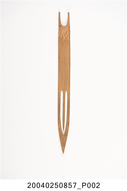 本物件為竹製漁網結網器,結網器為梭狀,除結網外亦作為修補漁網之用途,其材質有竹、木、鐵、銅、塑料,竹製為較常見,可略分為大號(約20-50cm,用來封漁網及修補粗線網)、小號(10cm以下,主要用來修補漁網)及介於其中的中號,中號由於大小適中,主要用來織各種漁網,結網器為織漁網的重要工具。