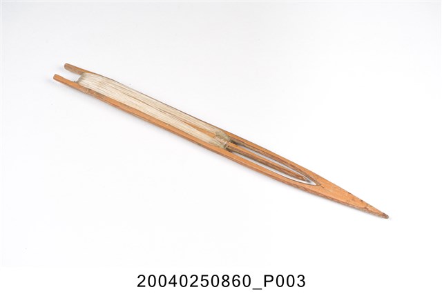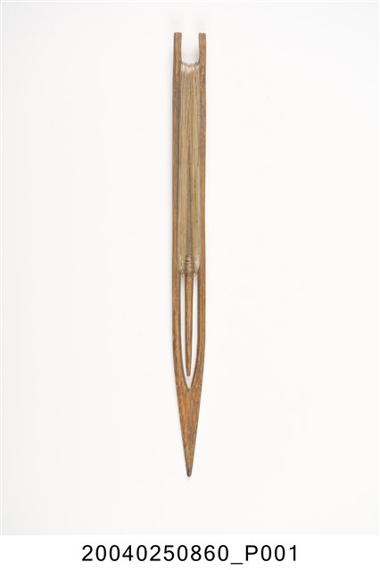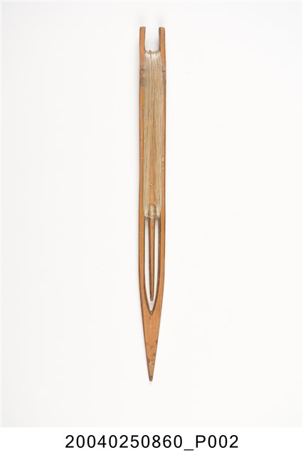 本物件為竹製漁網結網器,結網器為梭狀,除結網外亦作為修補漁網之用途,其材質有竹、木、鐵、銅、塑料,竹製為較常見,可略分為大號(約20-50cm,用來封漁網及修補粗線網)、小號(10cm以下,主要用來修補漁網)及介於其中的中號,中號由於大小適中,主要用來織各種漁網,結網器為織漁網的重要工具。