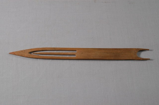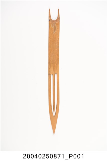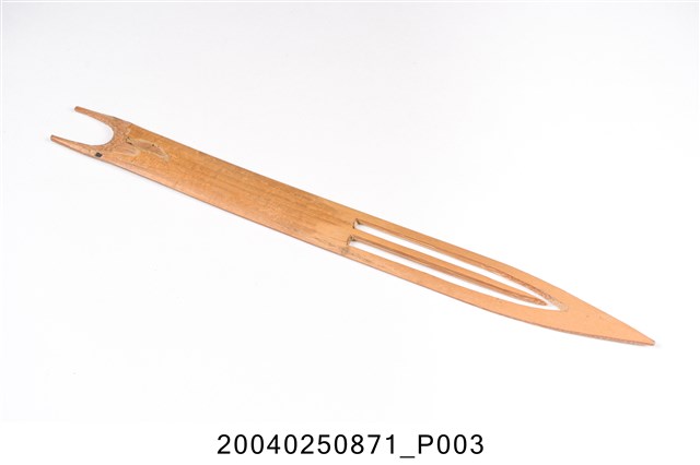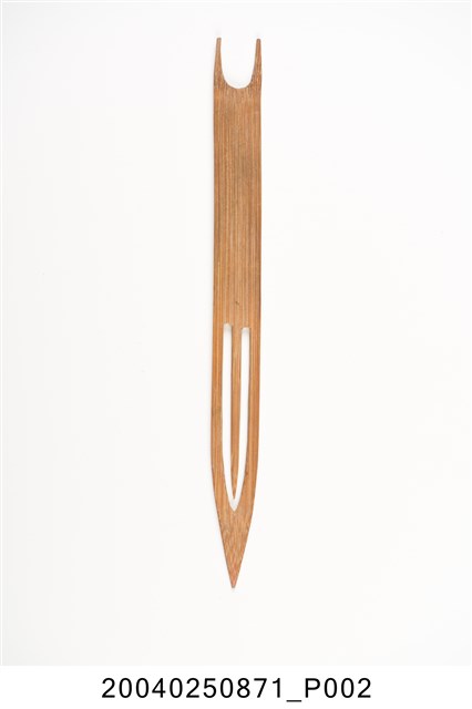 本物件為竹製漁網結網器,結網器為梭狀,除結網外亦作為修補漁網之用途,其材質有竹、木、鐵、銅、塑料,竹製為較常見,可略分為大號(約20-50cm,用來封漁網及修補粗線網)、小號(10cm以下,主要用來修補漁網)及介於其中的中號,中號由於大小適中,主要用來織各種漁網,結網器為織漁網的重要工具。