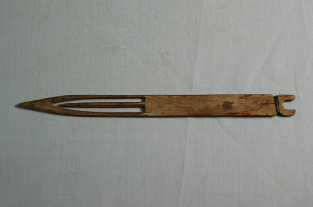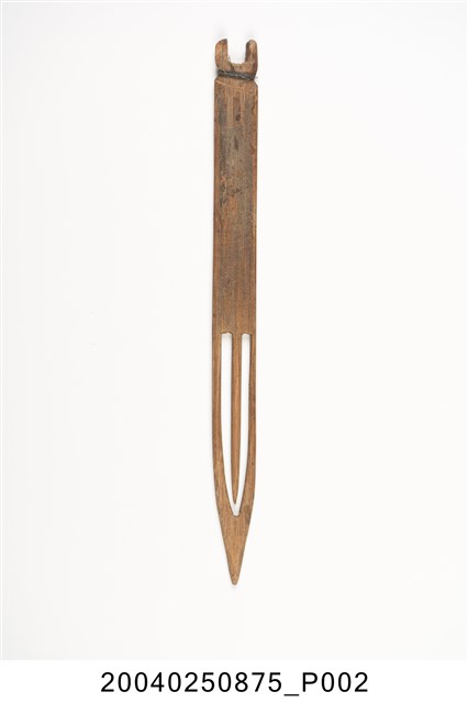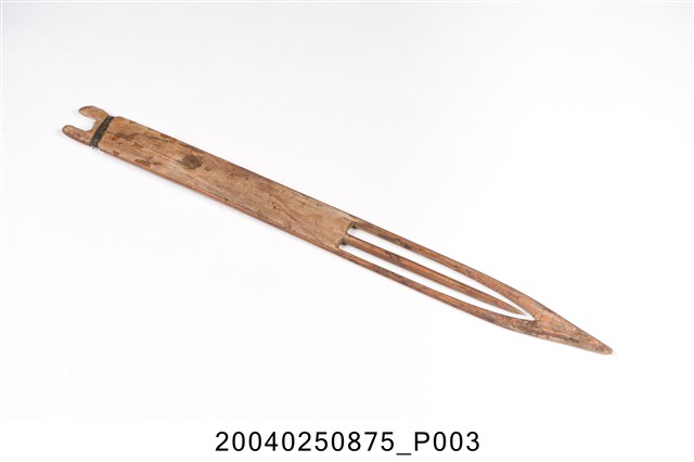 本物件為竹製漁網結網器,結網器為梭狀,除結網外亦作為修補漁網之用途,其材質有竹、木、鐵、銅、塑料,竹製為較常見,可略分為大號(約20-50cm,用來封漁網及修補粗線網)、小號(10cm以下,主要用來修補漁網)及介於其中的中號,中號由於大小適中,主要用來織各種漁網,結網器為織漁網的重要工具。