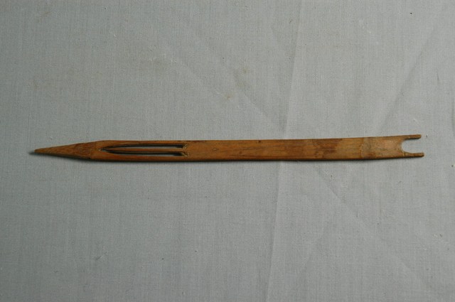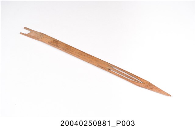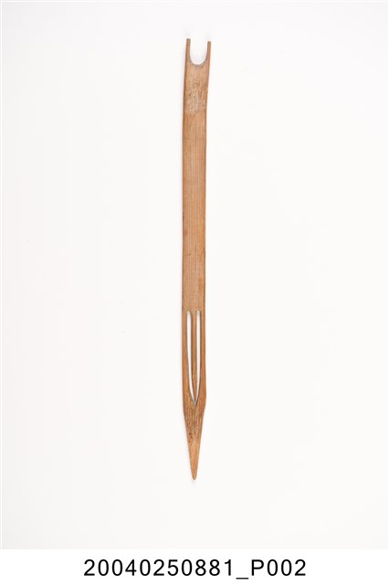 本物件為竹製漁網結網器,結網器為梭狀,除結網外亦作為修補漁網之用途,其材質有竹、木、鐵、銅、塑料,竹製為較常見,可略分為大號(約20-50cm,用來封漁網及修補粗線網)、小號(10cm以下,主要用來修補漁網)及介於其中的中號,中號由於大小適中,主要用來織各種漁網,結網器為織漁網的重要工具。