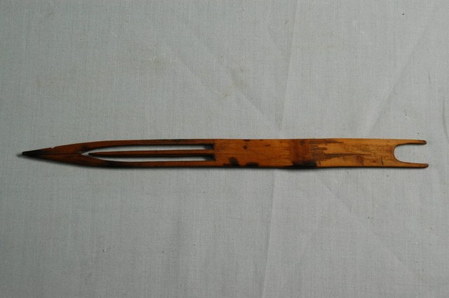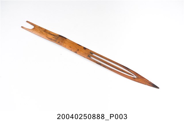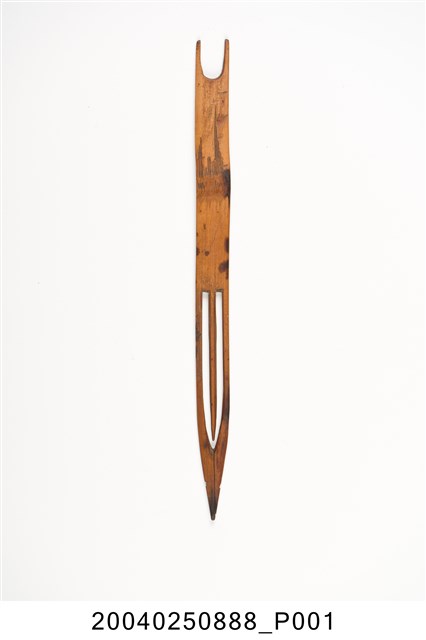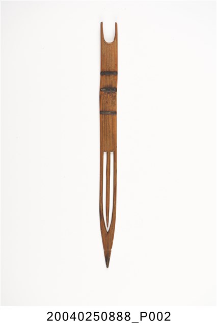 本物件為竹製漁網結網器,結網器為梭狀,除結網外亦作為修補漁網之用途,其材質有竹、木、鐵、銅、塑料,竹製為較常見,可略分為大號(約20-50cm,用來封漁網及修補粗線網)、小號(10cm以下,主要用來修補漁網)及介於其中的中號,中號由於大小適中,主要用來織各種漁網,結網器為織漁網的重要工具。