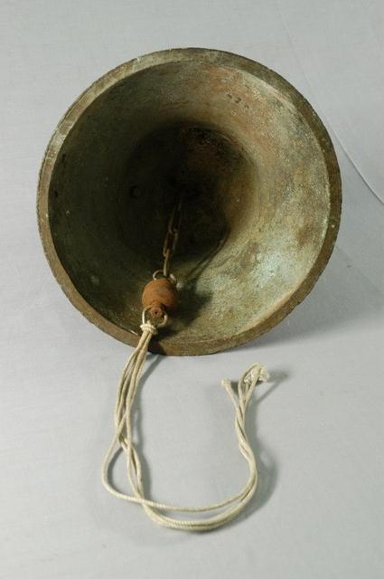 本物件為警鐘,整體材質主要為銅製,表面已有些生鏽髒汙,警鐘頂端有設置一個孔可穿過塑膠繩子。