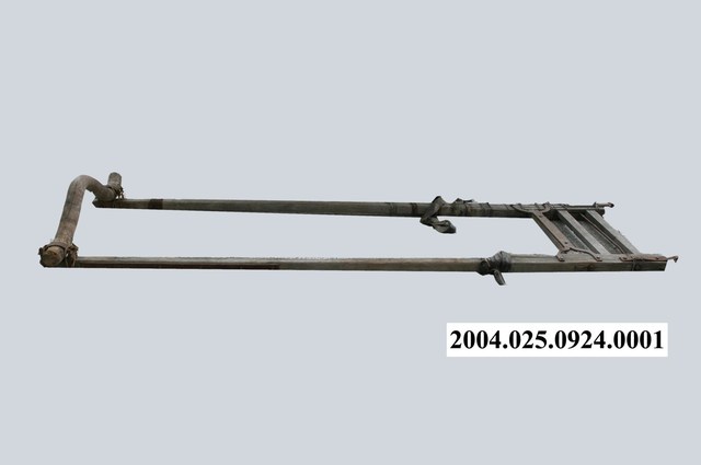 本物件為牛車之把手,架在橡皮四輪牛車旁,材質為木頭,把手部分有做彎曲設計,連接的木棍上有繩子繫著。