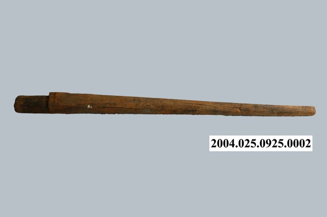 本物件為鐵皮四輪牛車的木棍,材質為木頭,形狀一端較細一端較粗。