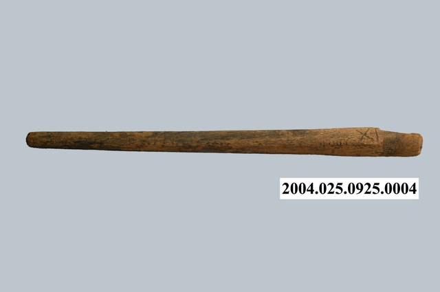 本物件為鐵皮四輪牛車的木棍,材質為木頭,形狀一端較細一端較粗。