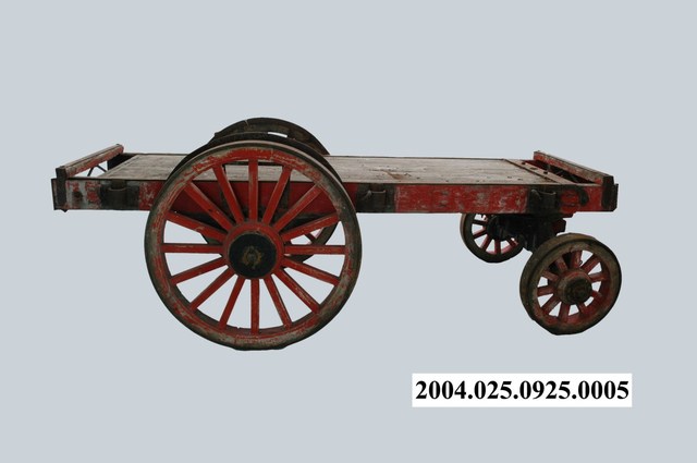 本物件為鐵皮四輪牛車,前後輪子大小不同,車身為一片金屬板,烤漆顏色為紅色。