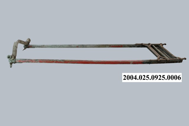 本物件為鐵皮四輪牛車把手,把手部分有做彎曲設計,烤漆顏色為紅色,有些部分已掉漆。