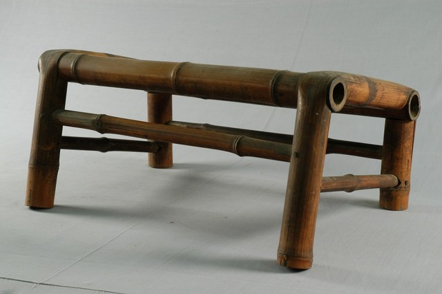 本藏品為竹製方形矮凳,長45.6公分、寬31.3公分,高20.7公分,主體以竹管榫接組成,短面橫向竹管彎撓成四支腿足,並榫接長面的橫向竹管,腿足之間以較細的竹管橫棖連接,椅面也是以竹篾拼接而成,整體而言構造簡單,給人古樸實用之感。