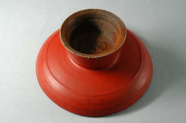 本件供盤上以紅漆,底座為中空中高圈足,盤內磨製成五圈弧,漆層保存完好。圈足內底有書寫K黃O字。