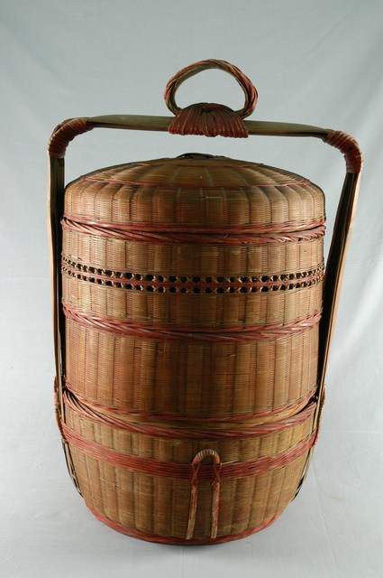 本件為臺南公廨竹編3層𣛮籃,採用臺灣民間容易取得的竹子剖成竹片、竹篾、竹絲,再用竹片、竹篾為支架,以篾條或篾皮交互編織3層圓形壁體及上蓋,整體均塗漆,部分上紅漆,保存完整。在提梁耳的正上方中間有1個圈孔。此𣛮籃原先放置於臺南市大內區平埔族公廨。