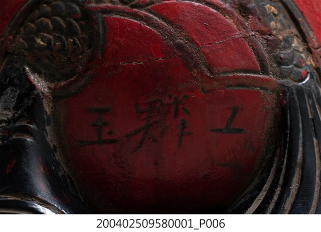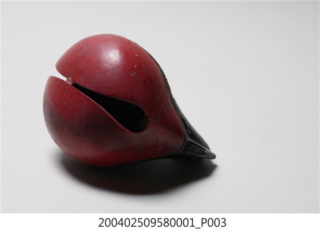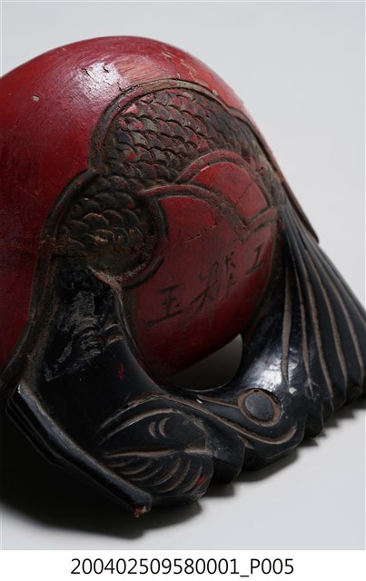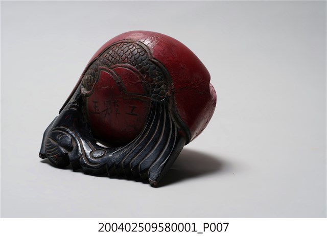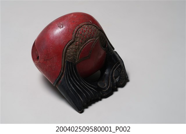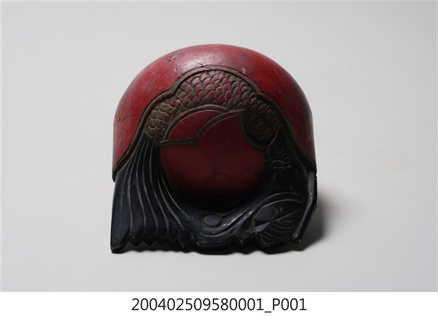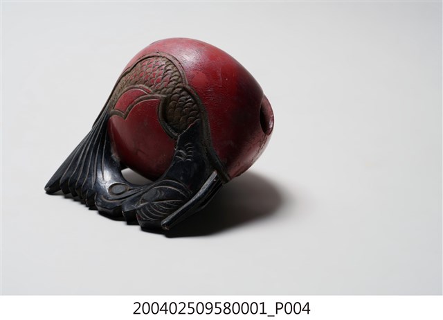 本組木魚與棒槌為一組配置,形體較小,以供移動中進行打擊,使用時以左手持木魚之龍頭部位,以右手持棒槌擊之。木魚在前端有一直條形缺口,開口並逐漸向兩端擴大,內部挖空。造形上在後端雕刻有一條身體捲曲成圓形、嘴部與尾部相接的龍魚,中央部位則有兩片左右對稱的麟狀紋飾,以及陰刻曲線捲紋。木魚的龍頭部位施黑漆,供敲打部份在表面則施朱漆,後端魚紋樣處則施黑漆,並有一道裂痕,魚身圈起處刻有「玉鱗工」三字。根據購藏來源資料,本件文物來自屏東。