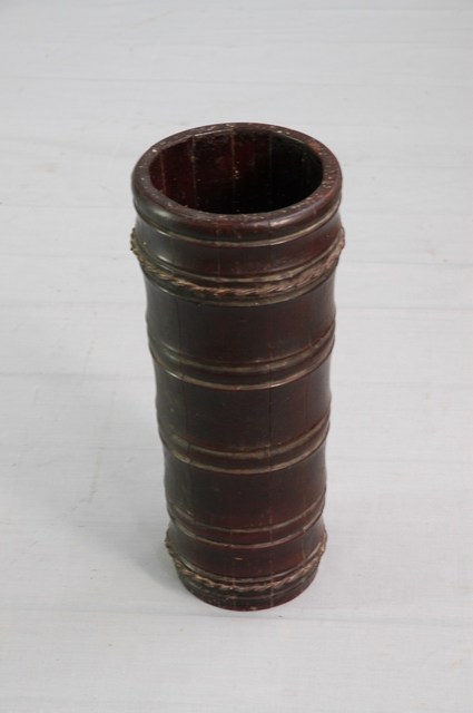 木製籤桶。籤桶是指存放籤枝的容器,多為竹製,形狀有圓形、六角型或八角型,高度視籤枝而定,一般為籤枝的三分之二。本件籤桶為木製圓桶型,製作方式是以寬度均等之木片圍成桶狀後,上下再以鐵絲緊縛,桶身呈上寬下略窄。在外觀上,桶身雕有環形刻紋,並漆上深咖啡色,高度約為籤枝的三分之二,桶身落款「聖籤」二字。