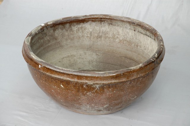 1. 褐釉素面拌米粉缸,敞口,口部下方略向內凹形成短直頸,凹痕下緣略像外呈尖角狀凸出,圓弧腹,平底,器身上寬下窄,整體呈缽形。全器素面無紋,器內外表面施褐色釉,外器壁腹部有些許自然落灰雜質附著,口沿及內器壁的釉料因使用而磨損,露出灰褐胎色。2. 此缸口部寬大,器身較淺,在製造米粉時用來攪拌粿粉團。