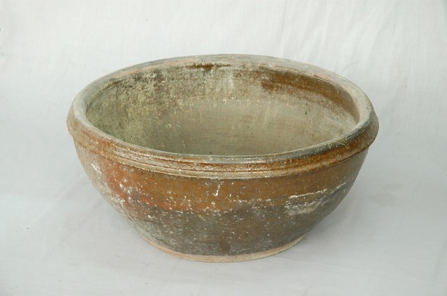 1. 褐釉素面拌米粉缸,敞口,口部下方略向內凹形成短直頸,凹痕下緣略像外呈尖角狀凸出,圓弧腹,平底,器身上寬下窄,整體呈缽形。全器素面無紋,器內外表面施褐色釉,外器壁上半部釉色較淺、下半部釉色較深,表面有些許自然落灰雜質附著,口沿及內器壁的釉料因使用而磨損,露出灰褐胎色。2. 此缸口部寬大,器身較淺,在製造米粉時用來攪拌粿粉團。