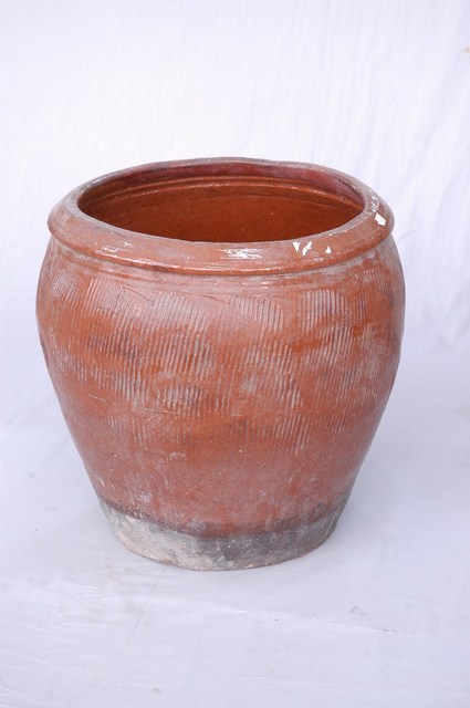 紅褐釉壓印直紋小水缸