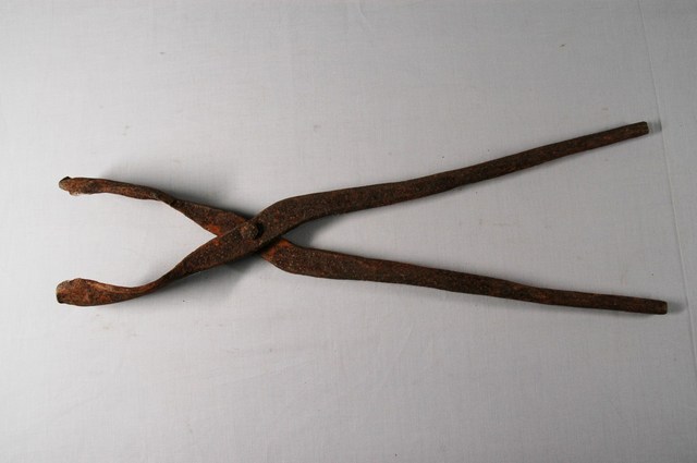 本文物為鐵鉗,為打鐵店用來夾取或彎折高溫軟化鐵件的工具,又稱打鐵鉗、火鉗、鍛造鉗、火夾。長度較長,便於深入高溫爐中夾取及避免拿取時遭高溫鐵件燙傷。鐵鉗以二支鐵條交叉,疊合處以螺絲固定。本件鐵鉗鉗頭短,鉗柄長,彎折成圈形,前端呈圓弧面,利於夾取棒狀或線形鐵件,為圓嘴鉗。螺絲後端為直柄,以手掌握合施力壓合鉗頭。根據典藏來源資料,本件文物收集來源地在花蓮。