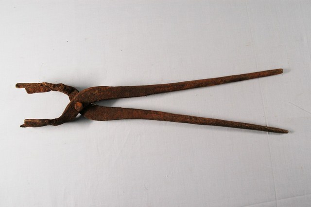 本文物為鐵鉗,為打鐵店用來夾取、彎折高溫軟化鐵件的工具,又稱打鐵鉗、火鉗、鍛造鉗、火夾。長度較長,便於深入高溫爐中夾取及避免拿取時遭高溫鐵件燙傷。鐵鉗以二支鐵條交叉,疊合處以螺絲固定。本件鐵鉗鉗頭短,鉗柄長,彎折成圈形,前端呈圓弧面,利於夾取、彎折棒狀或線形鐵件,為圓嘴鉗。螺絲後端為直柄,以手掌握合施力壓合鉗頭。根據典藏來源資料,本件文物收集來源地在花蓮。