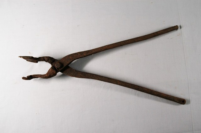 本文物為鐵鉗,為打鐵店用來夾取高溫軟化鐵件的工具,因此又稱打鐵鉗、火鉗、鍛造鉗、火夾。長度較長,便於深入高溫爐中夾取及避免拿取時遭高溫鐵件燙傷。鐵鉗以二支鐵條交叉,疊合處以螺絲固定。本件鐵鉗鉗頭短,鉗柄長,鉗頭彎折成圈型,前端合起呈扁平面,利於夾取棒狀或厚度較大鐵片,為平嘴鉗。一邊鉗頭前端斷裂不存。螺絲後端為直柄,以手掌握合施力壓合鉗頭。根據典藏來源資料,本件文物收集來源地在花蓮。