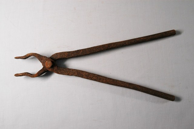 本文物為鐵鉗,為打鐵店用來彎折高溫軟化鐵件的工具,又稱打鐵鉗、火鉗、鍛造鉗、火夾。長度較長,便於深入高溫爐中夾取及避免拿取時遭高溫鐵件燙傷。鐵鉗以二支鐵條交叉,疊合處以螺絲固定。本件鐵鉗鉗頭短,鉗柄長,前端收尖,利於彎折塑形,為尖嘴鉗。螺絲後端為直柄,以手掌握合施力壓合鉗頭。根據典藏來源資料,本件文物收集來源地在花蓮。