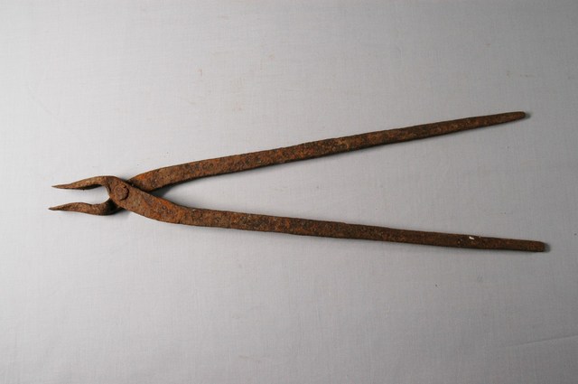 本文物為鐵鉗,為打鐵店用來夾取、彎折高溫軟化鐵件的工具,又稱打鐵鉗、火鉗、鍛造鉗、火夾。長度較長,便於深入高溫爐中夾取及避免拿取時遭高溫鐵件燙傷。鐵鉗以二支鐵條交叉,疊合處以螺絲固定。本件鐵鉗鉗頭短,鉗柄長,鉗頭彎折成圈型,前端合起呈扁平面,為平嘴鉗。圈形利於夾取棒狀或厚度較大鐵片,斜向扁平面可用於彎折。螺絲後端為直柄,以手掌握合施力壓合鉗頭。根據典藏來源資料,本件文物收集來源地在花蓮。