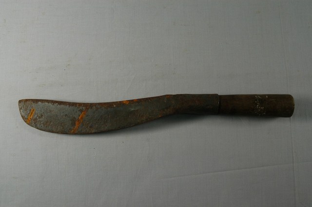 本文物為鐮刀,是竹工用來刮竹青的工具。鐮刀鐵件為彎月形,內緣為刃。鐵件後端做成圓筒形箍以置木柄,為傳統漢式農具做法。根據購藏來源資料,本件工具來自屏東。