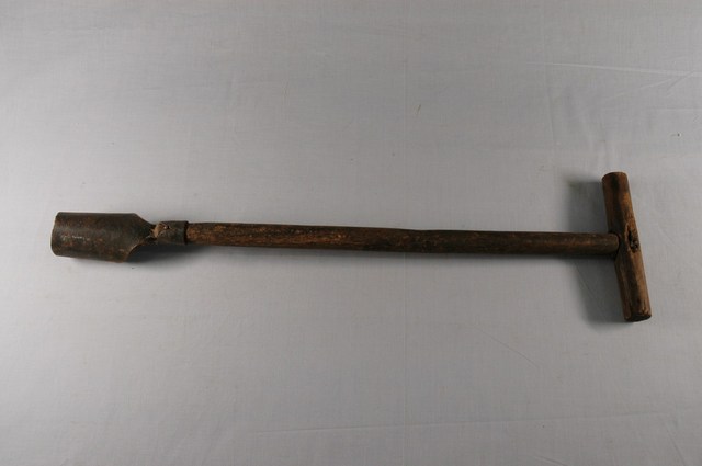 本文物為鑿,為竹工工具。原是挖土洞的農具,稱為土鑿。鑿頭為窄長的扁刀片,前端刀口為圓口刃。刀後端收為圓筒形箍以套入木柄,為傳統漢式農具作法。本件木柄後端加橫柄,做為手握柄。竹工用以鑿穿竹管中的竹節。根據購藏來源資料,本件工具來自屏東。