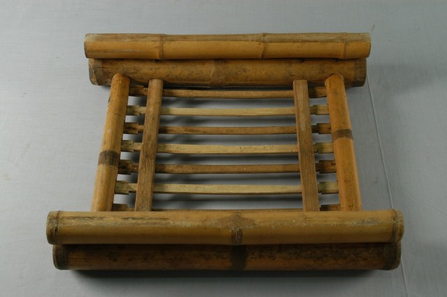 1.本物件是一把竹工藝師傅的小矮凳,矮凳高度雖不高,但更有助於竹工藝師施作的方便性,且不必席地而坐。本件高度9.3cm。矮凳兩側分別由兩根竹管重疊做為椅子支架,竹片組裝成椅面。