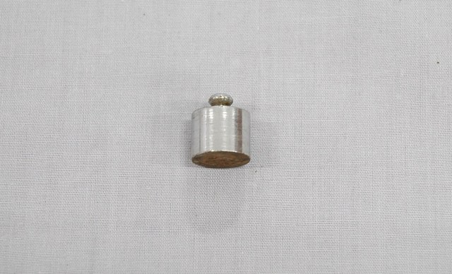 1.本物件為秤重設備,天平秤專用之砝碼。圓柱狀,上方有一突點,方便使用夾子夾取。本物件為金屬製品,砝碼上面有刻「10g」字樣,上方突點連接處有生鏽。