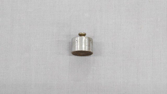 1.本物件為秤重設備,天平秤專用之砝碼。圓柱扁狀,上方有一突點,方便使用夾子夾取。本物件為金屬製品,砝碼上面有刻「5g」字樣,物件全身皆有生鏽。