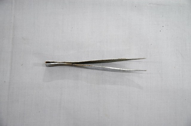 1.本物件為天平秤專用砝碼夾子,用於夾取砝碼,避免其受到其他物質接觸影響重量,中央處生鏽嚴重,其他地方則些許鏽斑。