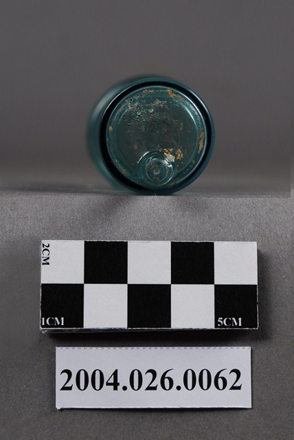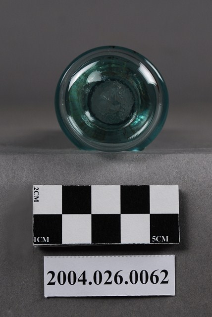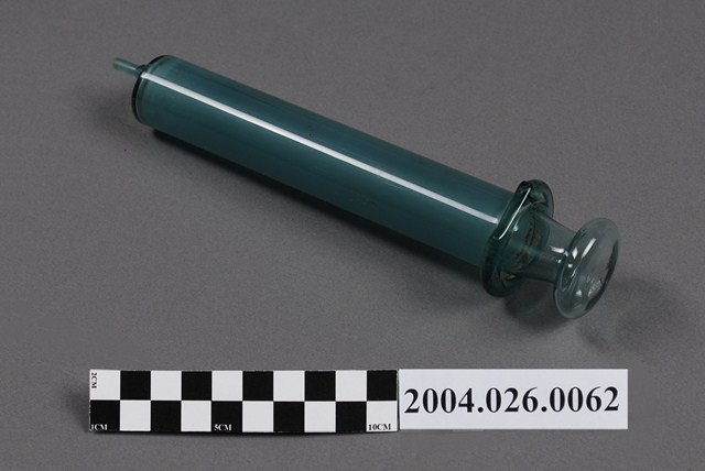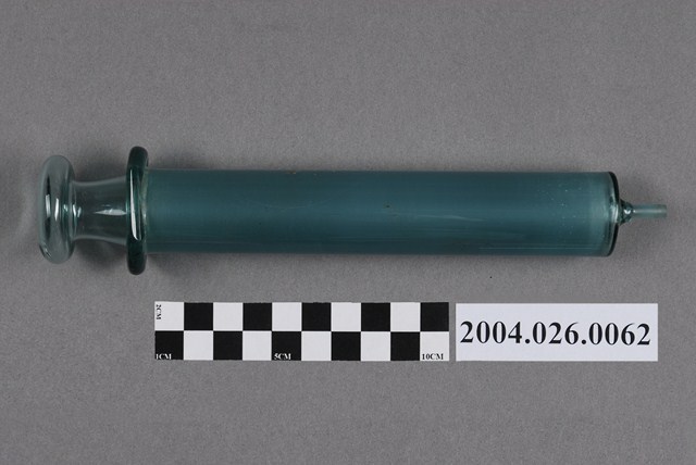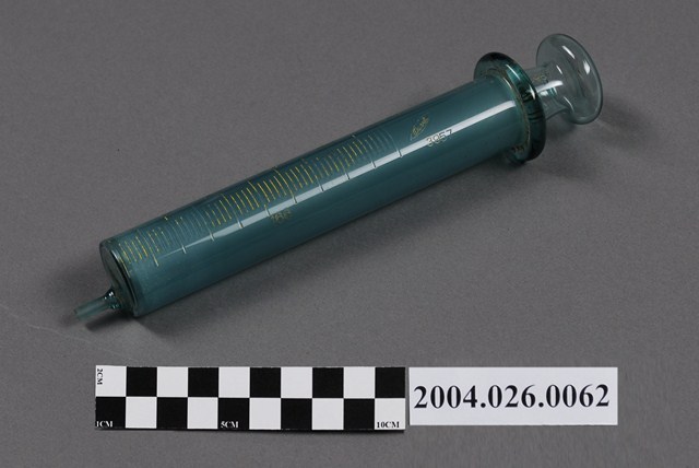 本物件為珍珠牌(Pearl)50c.c.綠色玻璃針筒。針筒有金黃色刻度,共有50個刻度,有些刻度模糊不清。