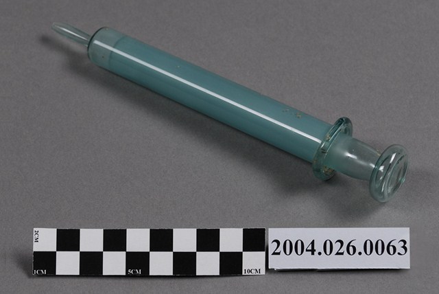 本物件為珍珠牌(Pearl)30c.c.綠色玻璃針筒。針筒有金黃色刻度,共有6個刻度。