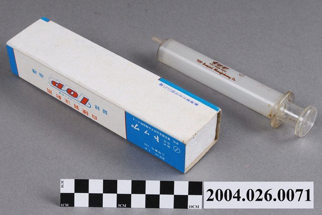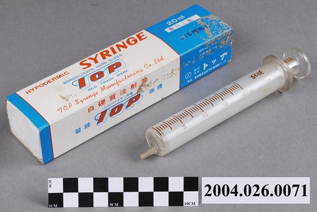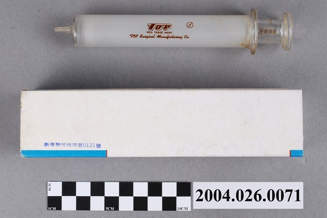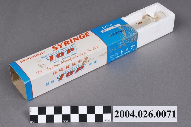 1. 本物件為トツプ株式會社出品TOP 20ml白硬質注射筒。共有2個物品,分別是包裝盒與注射筒。 2. 本產品標有衛署醫器輸字第0121號,經查衛生福利部食品藥物管理署,此注射筒許可證字號有效日期為西元1974年6月29日至1987年6月29日,故注射筒應為西元1974年開始輸入臺灣。