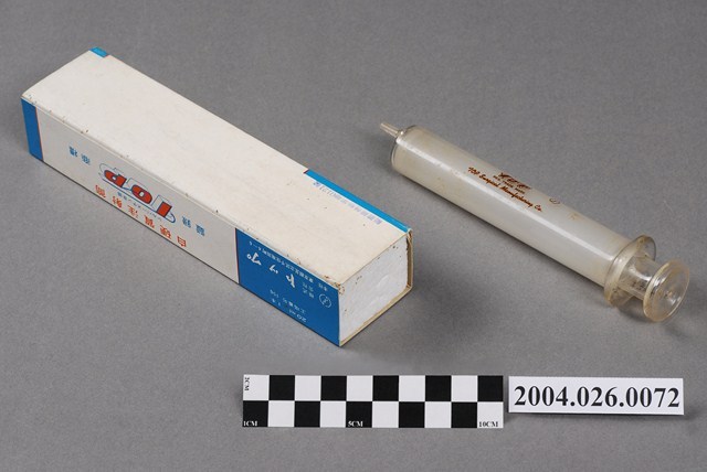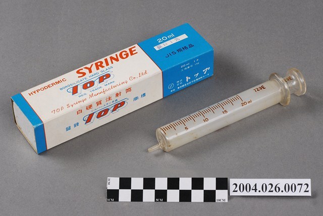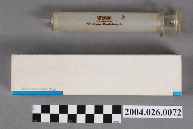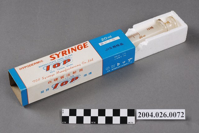 1. 本物件為トツプ株式會社出品TOP 20ml白硬質注射筒。共有2個物品,分別是包裝盒與注射筒。 2. 本產品標有衛署醫器輸字第0121號,經查衛生福利部食品藥物管理署,此注射筒許可證字號有效日期為西元1974年6月29日至1987年6月29日,故注射筒應為西元1974年開始輸入臺灣。