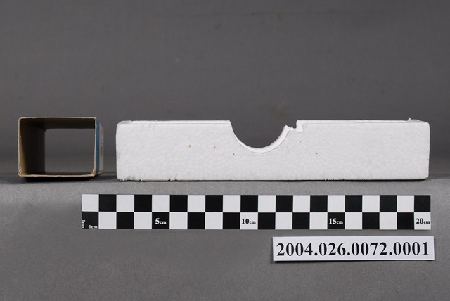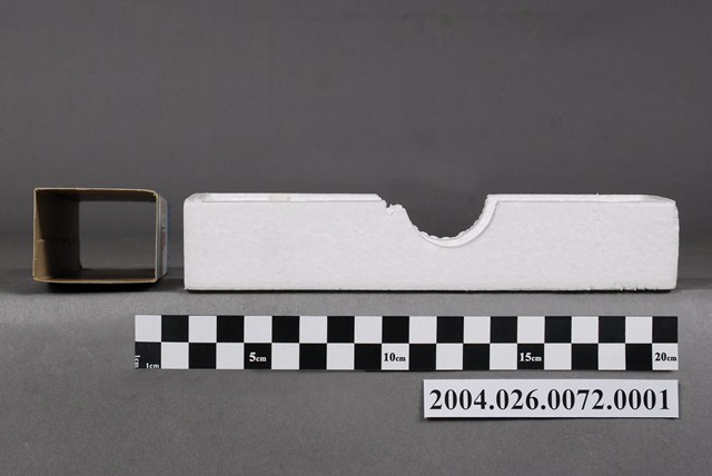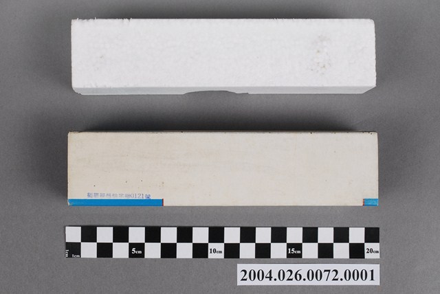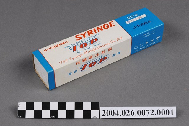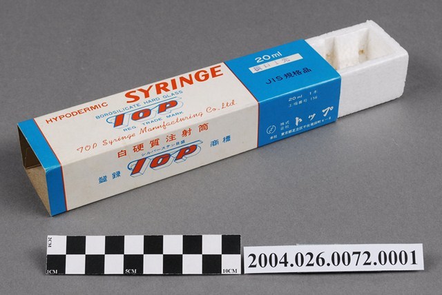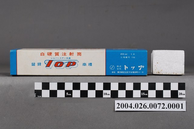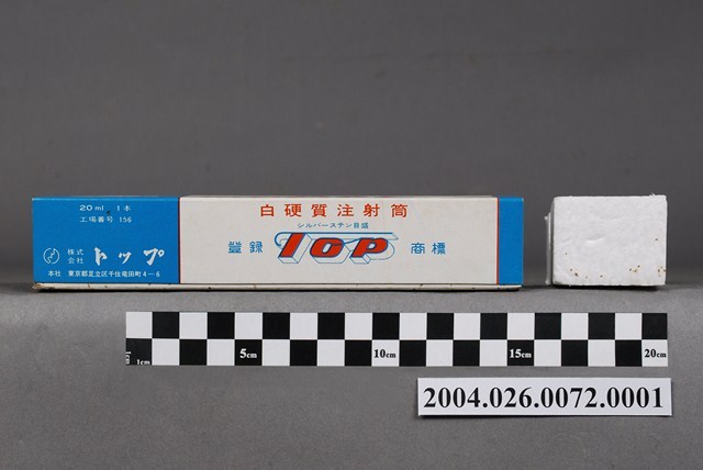 1. 本物件為トツプ株式會社出品TOP 20ml白硬質注射筒包裝紙盒。包裝紙盒外觀印有註冊商標,以及HYPODERMIC、SYRINGE、BOROSILICATE HARD GLASS、白硬質注射筒、衛署醫器輸字第0121號、20ml與JIS規格品等字樣 。包裝盒內有保麗龍容器,放置注射筒用。 2. 本產品標有衛署醫器輸字第0121號,經查衛生福利部食品藥物管理署,此注射筒許可證字號有效日期為西元1974年6月29日至1987年6月29日,故注射筒應為西元1974年開始輸入臺灣。