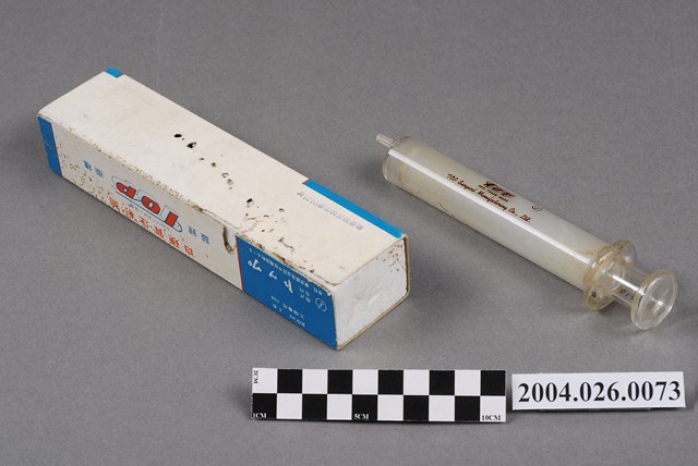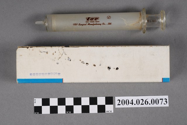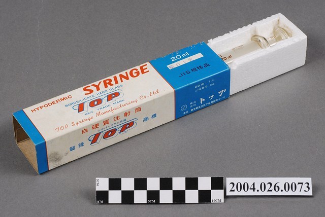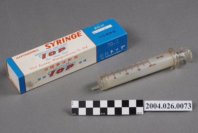 1. 本物件為トツプ株式會社出品TOP 20ml白硬質注射筒。共有2個物品,分別是包裝盒與注射筒。 2. 本產品標有衛署醫器輸字第0121號,經查衛生福利部食品藥物管理署,此注射筒許可證字號有效日期為西元1974年6月29日至1987年6月29日,故注射筒應為西元1974年開始輸入臺灣。