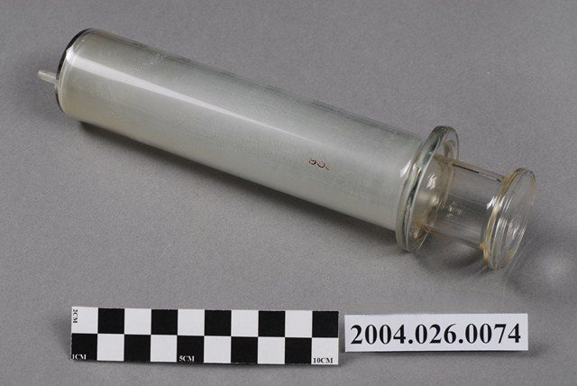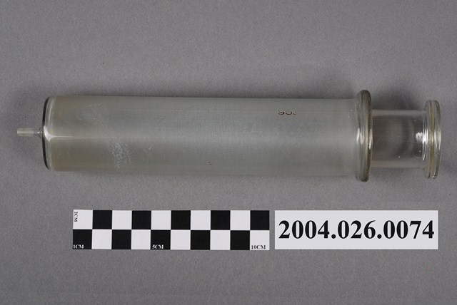 本物件為針筒100c.c.。針筒為透明無色,共有50個刻度,刻度上標有20、40、60、80和100之數字與cc字樣。針筒還印有ANGEL註冊商標和9527字樣。