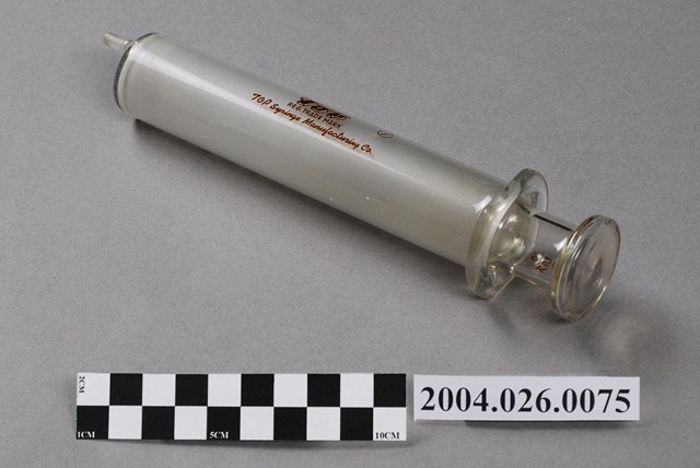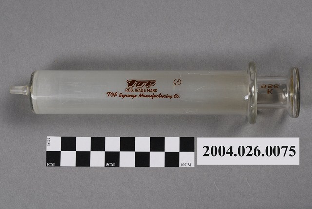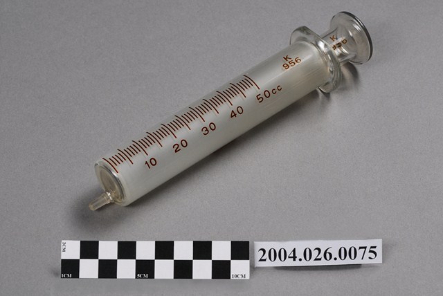 本物件為針筒50c.c.。針筒為透明無色,共有50個刻度,刻度上標有10、20、30、40和50之數字與cc字樣。針筒還印有K956字樣以及註冊商標與製造商。