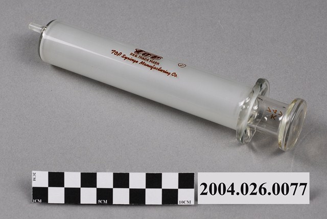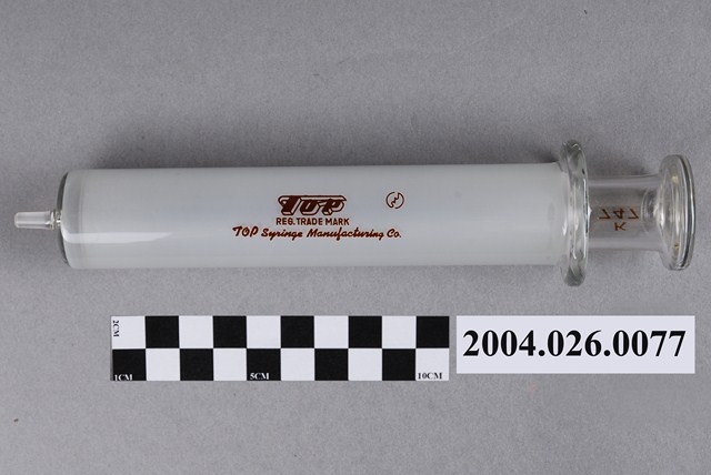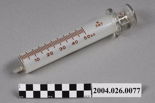 本物件為針筒50c.c.。針筒為透明無色,共有50個刻度,刻度上標有10、20、30、40和50之數字與cc字樣。針筒還印有K747字樣以及註冊商標與製造商。