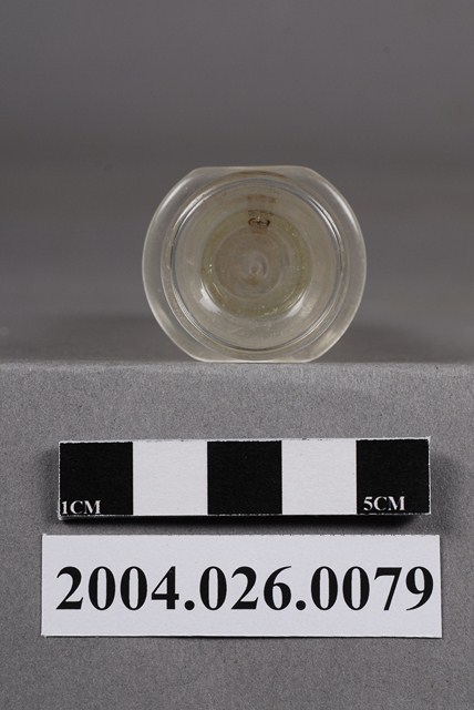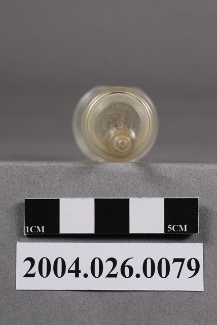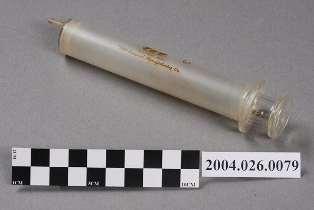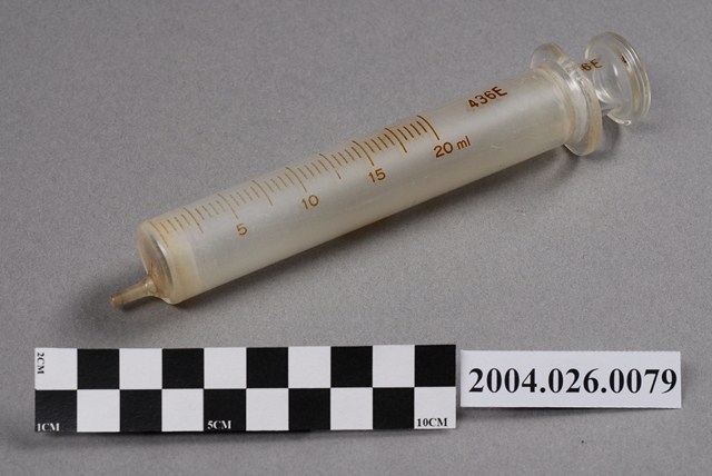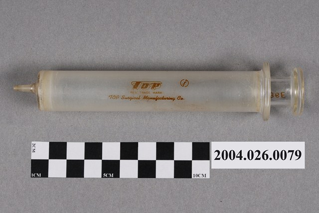 本物件為針筒20c.c.。針筒為透明無色,共有40個刻度,刻度上標有5、10、15和20之數字與ml字樣。針筒還印有436E字樣以及TOP註冊商標與製造商。