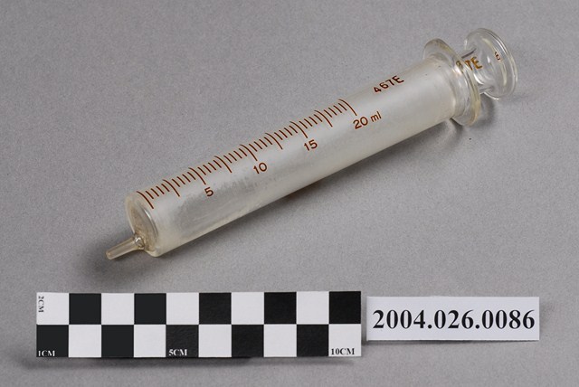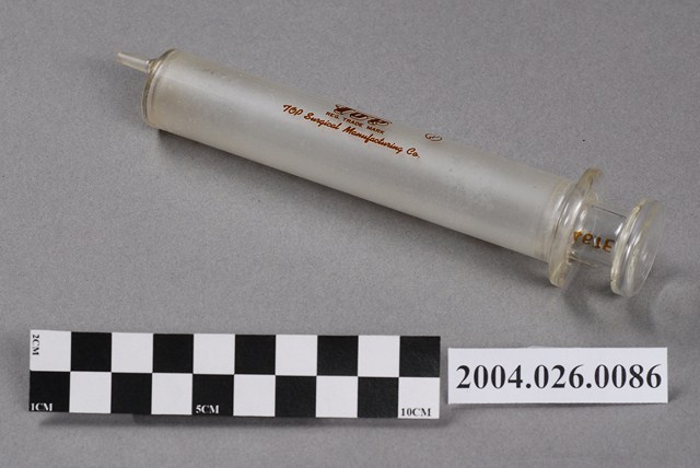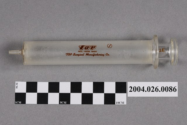 本物件為針筒20c.c.。針筒為透明無色,共有40個刻度,刻度上標有5、10、15和20之數字與ml字樣。針筒還印有467E字樣以及TOP註冊商標與製造商。